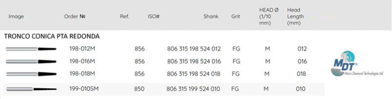 Descubra la excelencia en fresas de diamante y abrasivos para odontología con la Fresa Diamante Tronco Conica Punta Redonda de MDT, el reconocido fabricante israelí en este sector.